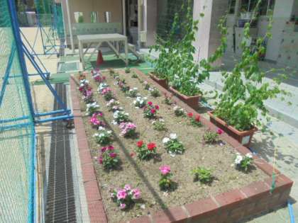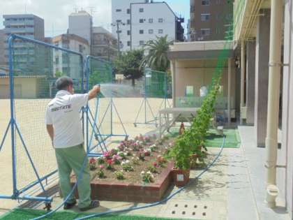 管理作業委員の小林さんが、植物に水をあげています。花もゴーヤも、喜んでいます。