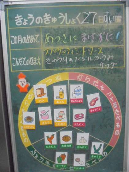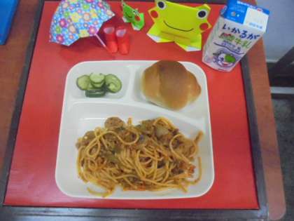 今日の献立は、スパゲッティミートソース、きゅうりのバジル風味サラダ、パン、牛乳です。