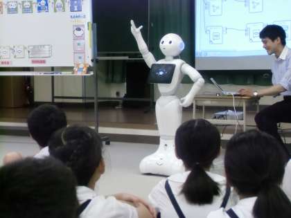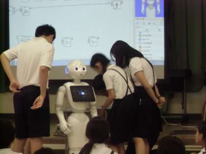 7月2日(月)5,6年生は、ロボットのペッパー君を招いてプログラミングの出前授業を受けました。