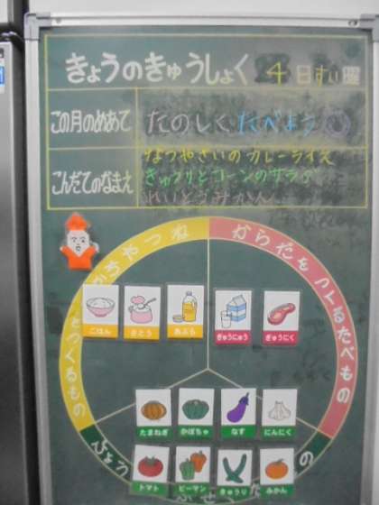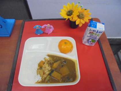 今日の献立は、夏野菜のカレーライス、きゅうりとコーンのサラダ、冷凍みかん、ごはん、牛乳です。