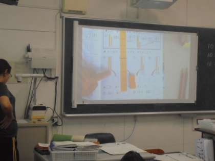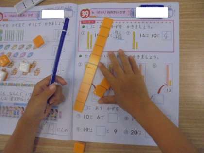 (上・中)算数の学習です。書画カメラやおはじきで工夫しています。