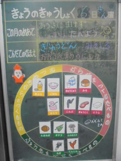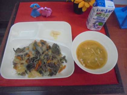 今日も、おいしくいただきました。献立は、牛丼、とうがんのみそ汁、大福豆の煮もの、ごはん、牛乳です。