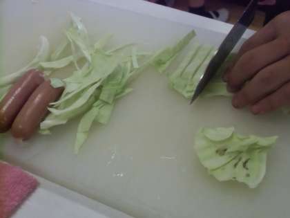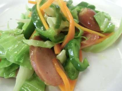 キャベツは短冊切り、人参は拍子木切り、ピーマンは細切り、ウインナーは斜め切りにします。昨年、おそるおそるだった包丁使いも様になってきました。