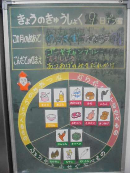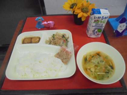 今日の献立は、ゴーヤチャンプルー、すまし汁、あつあげのみそだれかけ、ごはん、牛乳です。
