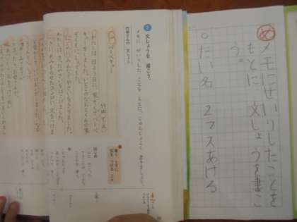 (上)国語の学習で、「文しょうを書こう」を勉強しています。