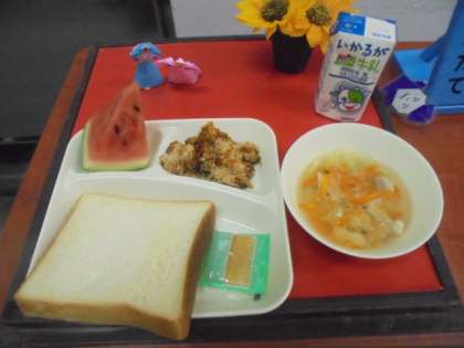 今日の献立は、かぼちゃのミートグラタン、スープ、すいか、食パン、牛乳です。