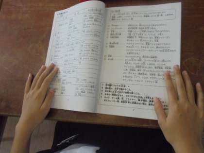 林間学習のしおりを使って、持ち物や心構えなどを説明しています。