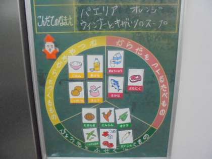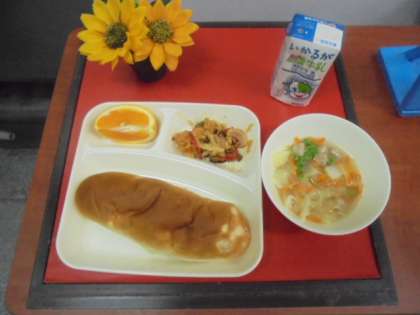 今日の献立は、パエリア、ウインナーとキャベツのスープ、オレンジ、おさつパン、牛乳です。17日(火)〜19日(木)までは、給食室工事のため、調理を伴わない給食献立になります。