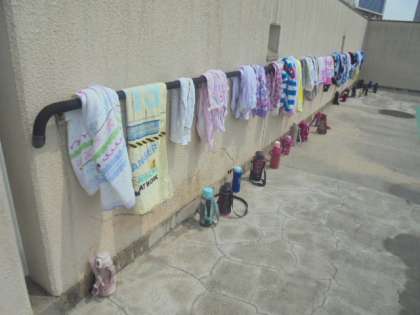 (下)水分補給のため、プールサイドに水筒を置いています。