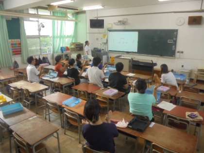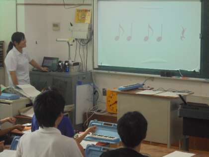 子どもたちが下校した後、教職員が集まり、音楽科の実技研修を行いました。1年2組の井戸田先生が講師です。2学期早々、教職員は授業力の向上に努めています。