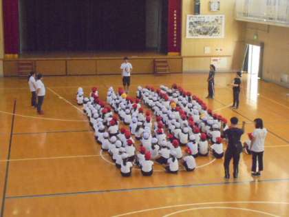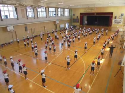 運動会の練習が始まりました。体育館で、団体演技(ダンス)練習です。