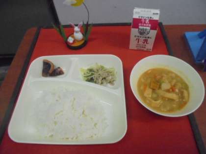 今日の献立は、たこのやわらか煮、みそ汁、野菜いため、ごはん、牛乳です。