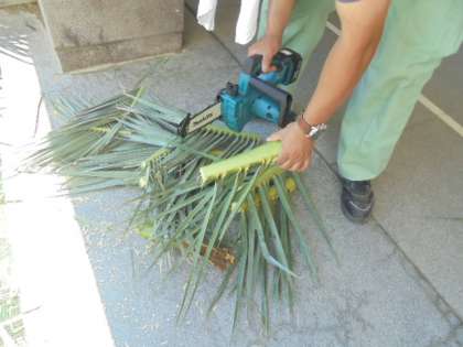 台風の影響で、運動場南側にあるフェニックスの大きな葉が落ちていました。管理作業員の小林さんが、小さく切って処分してくださっています。
