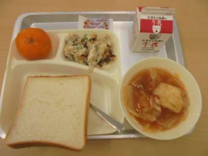 今日の献立は、豆乳マカロニグラタン(米粉使用)、トマトスープ、みかん(冷)、パン、牛乳です。