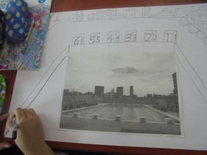 (下)屋上プールから見た景色を描いています。