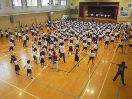 今朝の児童集会は、ラジオ体操の練習です。運動委員会の子どもたちや体育主任の梶原尚徳先生が、模範を示してくれました。