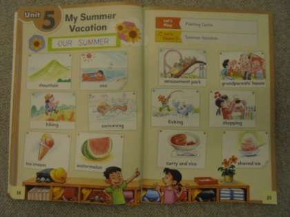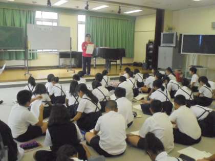 多目的室で、外国語活動をしています。子どもたちは、集中しています。