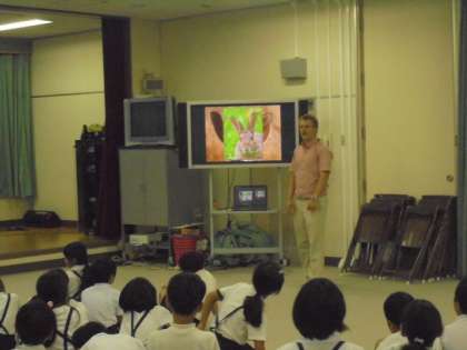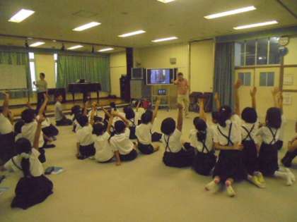 外国語活動の時間です。C-NET(大阪市の外国語指導員)のブライアン先生たちが、ゲーム形式で進めています。