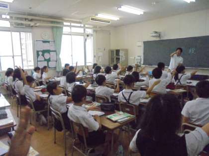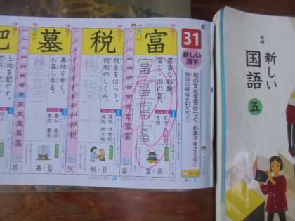 漢字の学習をしています。先生に合わせて、書き順の練習です。