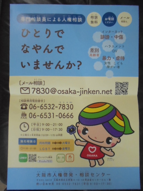大阪市人権啓発・相談センターが実施している人権相談事業の案内です。メールや電話で相談することができます。⇒ひとりで なやんで いませんか?