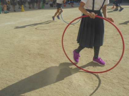 今朝の児童集会は、たてわりグループによる「フラフープ・リレー」です。上手に転がしています。