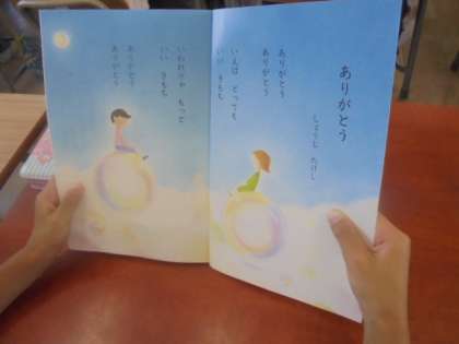 (上)国語の教科書「ありがとう」(しょうじ たけし)です。