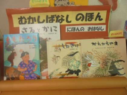 学校図書館補助員の小前先生が、昔話の本を展示してくださっています。