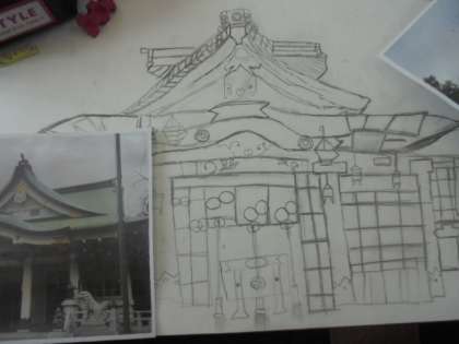 難波八阪神社の写生です。出来上がりが楽しみです。