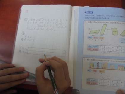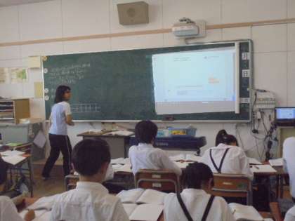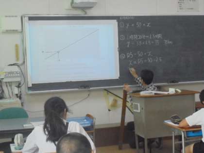 算数の学習です。書画カメラやデジタル教科書等を使って、比例や反比例をとてもわかりやすく教えています。
