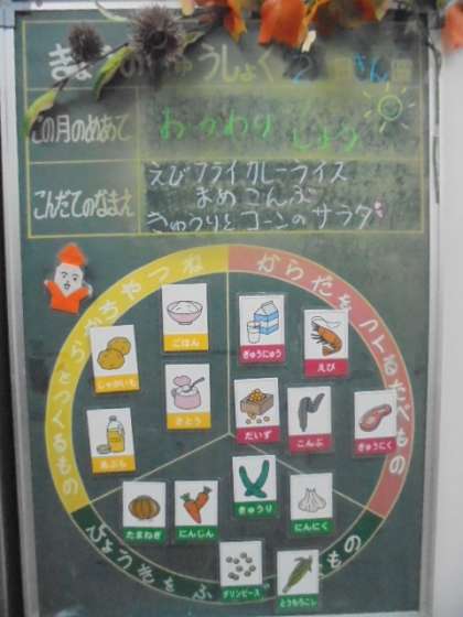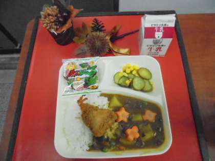 今日の献立は、えびフライカレーライス、きゅうりとコーンのサラダ、豆こんぶ、ごはん、牛乳です。