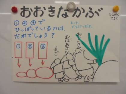 学校図書館補助員の小前先生からの「おおきな かぶ」クイズです。さて、正解は・・・?