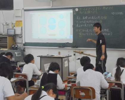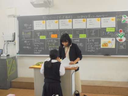 (下)栄小学校の栄養教諭 四條先生が、野菜のはたらきについて教えてくださいました。