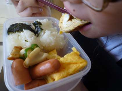 大きなお口でパクリ。「卵焼き、家で作るときは、ネギ入れよう。」「ハム入れよう。」「マヨネーズで味付けしてみよう。」と、とても楽しんで、自信をつけた調理実習でした。