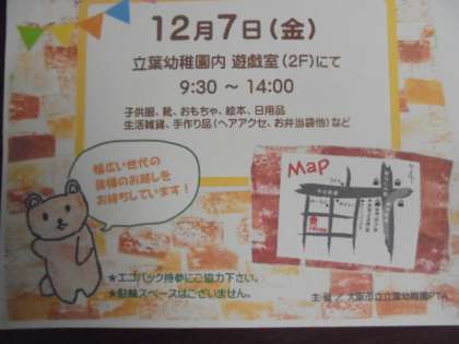 大阪市立立葉幼稚園PTAの皆様から、とても素敵なポスターが届きました。12月7日(金)は、そうだ、みんなで立葉幼稚園のバザーへ行こう!