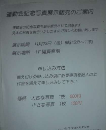 11月23日(金)学習参観、作品展の8:45から11:00までの間、業者が運動会の写真展示販売をします。1階職員室前付近に展示し、代金はその場で写真業者に渡していただきます。この日のこの時間帯のみの展示、販売になります。