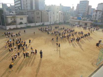 今朝の児童集会は、たてわりグループでドリブルリレーです。
