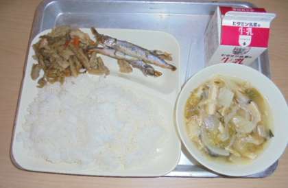 今日の献立は、焼きししゃも、五目汁、きんぴらごぼう、ごはん、牛乳です。とてもおいしくいただきました。