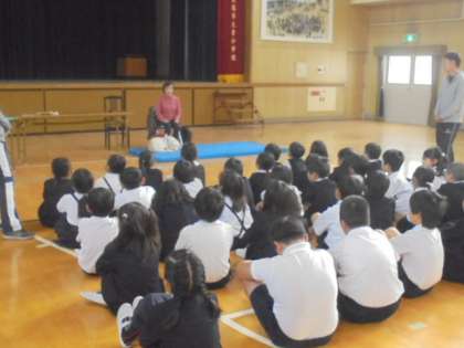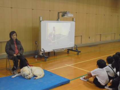国語の教科書に「もうどう犬の訓練」という単元があります。今日は、盲導犬ユーザーの山本美惠子さんと盲導犬フェリシアちゃんをお招きして、子どもたちにお話をしていただきました。山本さんのお話やDVDなどを通して、子どもたちは障がいについての理解を深めることができました。