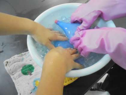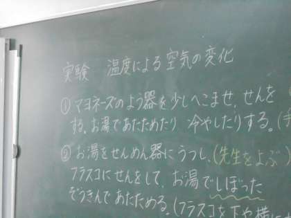 (中・下)理科「もののの温度と体積」の学習です。温度による空気の変化を調べています。