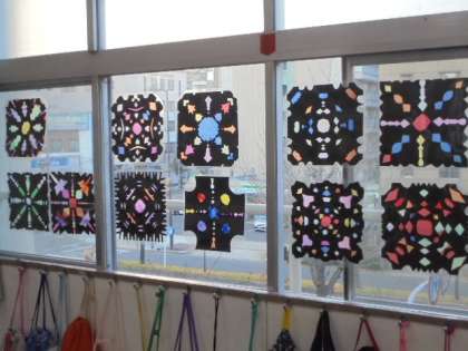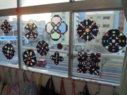 教室の窓に、オーナメントを飾っています。美しい作品です。