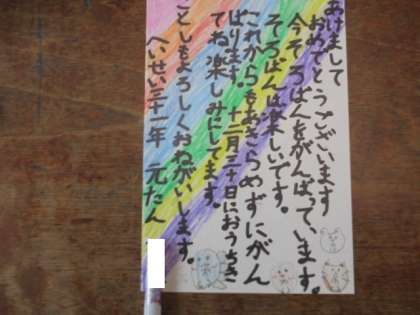 (上)郵便局からいただいた年賀はがきで年賀状を書いています。「お母さんのお姉さんに出すねん」。優しい気持ちがこもった年賀状です。