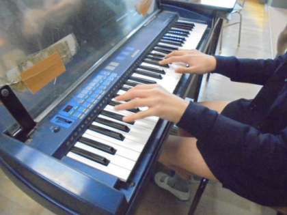 (下)教室で電子オルガンを弾いています。楽譜を暗記しています。