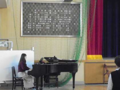 (下)校歌のピアノ伴奏は、音楽主任の井戸田先生です。