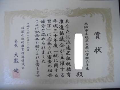税に関する習字に応募し、入選した子どもたちへ、終業式で榊 正文浪速区長が表彰状を渡してくださいました。たくさんの拍手に包まれ、子どもたちはとても嬉しそうです。榊区長をはじめ、ご来校くださった関係者の皆様、ありがとうございました。