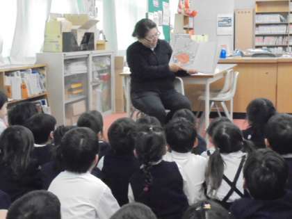 (中)図書室で、絵本の読み聞かせをしています。