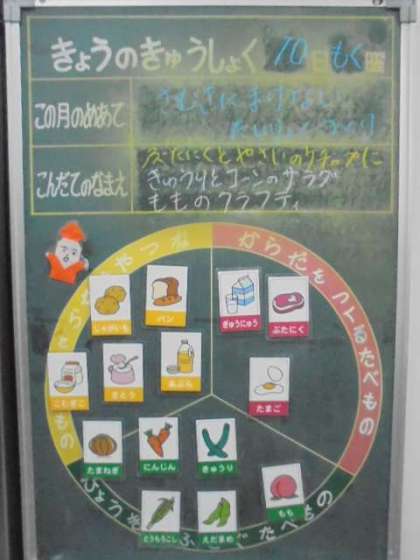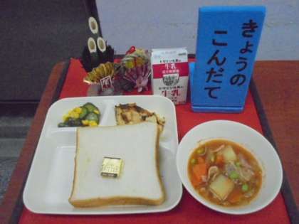 今日の献立は、豚肉と野菜のケチャップ煮、きゅうりとコーンのサラダ、桃のクラフティ、パン、牛乳です。