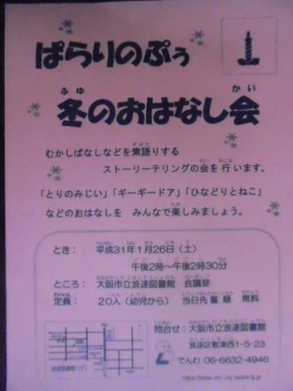 1月26日(土)午後2時から2時30分まで、浪速図書館で昔話など楽しむ会が開かれます。定員20名(幼児から)。当日先着順です。
