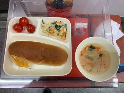 今日の献立は、大型コッペパン、牛乳、ほたて貝のグラタン、だいこんのスープ、プチトマトです。