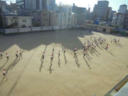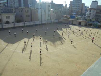 運動場で、BGMに合わせて体をほぐしています。