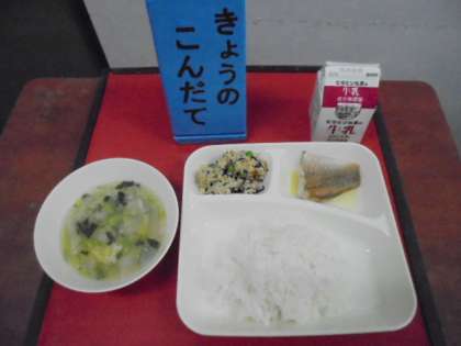 今日の献立は、赤魚のレモンじょうゆかけ、うすくず汁、高野どうふのいり煮、ごはん、牛乳です。